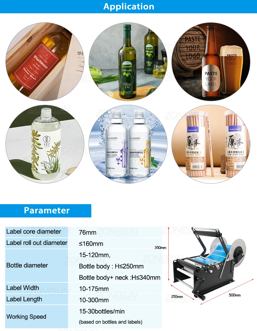Dirancang untuk pelabelan stiker pada botol bulat seperti botol anggur, botol bir, botol minuman, botol air DLL. Ini banyak digunakan dalam industri makanan, minuman, kosmetik dan farmasi.
